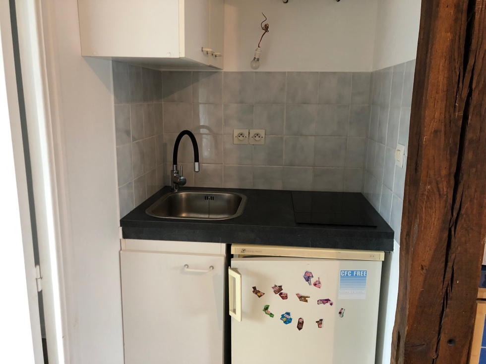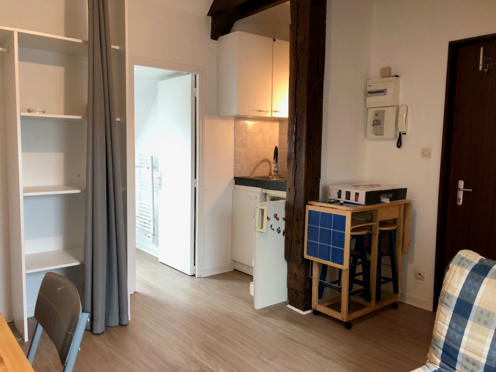 Au 4ème étage, un studio entièrement rénové et meublé comprenant une pièce principale (bureau, table pliante, canapé BZ, coin nuit avec matelas 1 place) et coin cuisine équipée (frigo top, plaques électriques), salle de bains et wc. Chauffage électrique. Vélux bois double vitrage avec volets électriques CHARGES= TOM + COMMUN « Les informations sur les risques auxquels ce bien est exposé sont disponibles sur le site Géorisques : www.georisques.gouv.fr ».